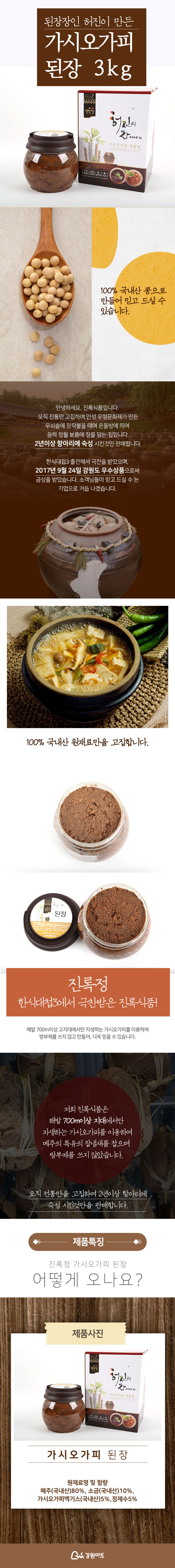 본제품은 제조자가 직접 농사를지어 우리나라 전통장인이 만든 명품무쇠가마 큰 솥에 메주콩을 쪄서 온돌방에서 메주를 숙성시켜, 전통 장독대 항아리에서 2년 이상 자연숙성시킨 청정재료를 사용한 전통 기능성 장류 상품입니다. 서양의 인삼이라는 가시오가피의 성분과 전통 장의 영양이 조화된 특별한 된장을 맛보세요.